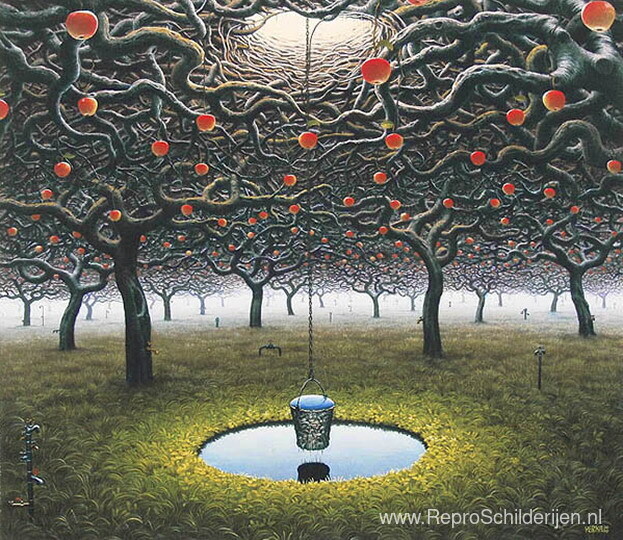 Wij bieden u een ambachtelijke reproductie op doek van het beroemde schilderij 'Tuin' van Jacek Yerka, afkomstig uit het Reproductiemuseum.