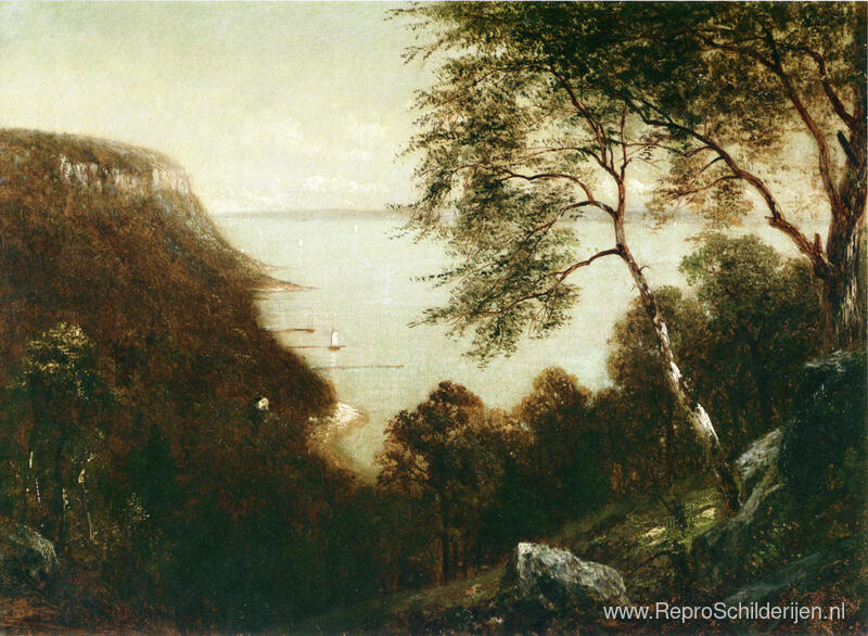 Wij bieden u een ambachtelijke reproductie op doek van het beroemde schilderij 'Uitzicht op Palisades, Hudson River ' van David Johnson, afkomstig uit het Reproductiemuseum.
