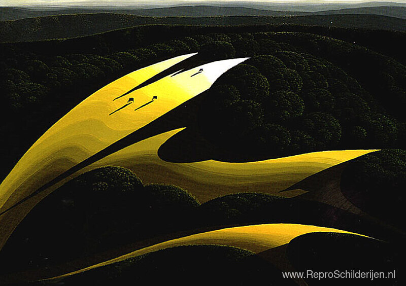 Wij bieden u een ambachtelijke reproductie op doek van het beroemde schilderij 'Zomermiddag' van Eyvind Earle, afkomstig uit het Reproductiemuseum.