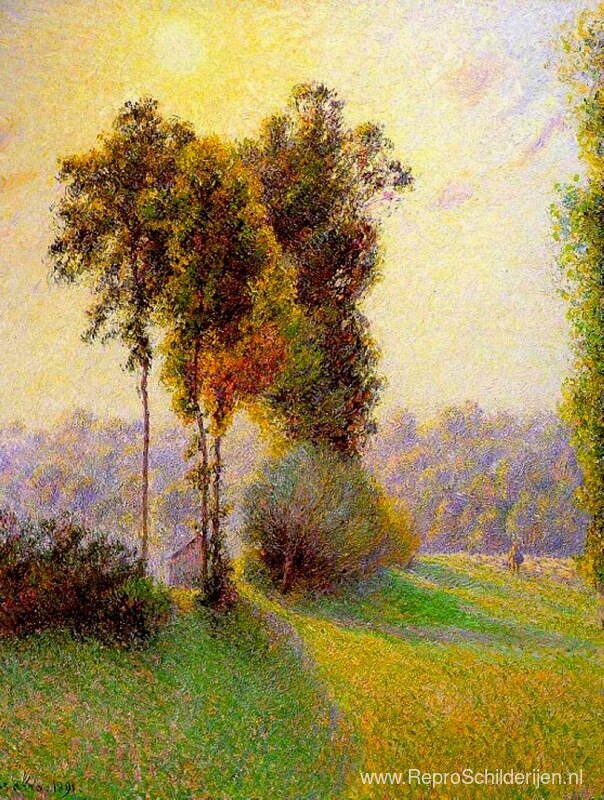 Wij bieden u een ambachtelijke reproductie op doek van het beroemde schilderij 'Zonsondergang bij Sent Charlez. Eragny' van Camille Pissarro, afkomstig uit het Reproductiemuseum.