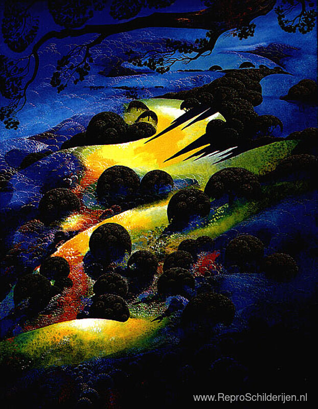 Wij bieden u een ambachtelijke reproductie op doek van het beroemde schilderij 'Zonsondergang vlam' van Eyvind Earle, afkomstig uit het Reproductiemuseum.