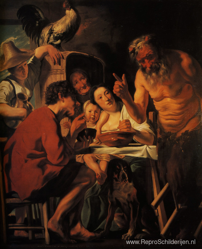 Wij bieden u een ambachtelijke reproductie op doek van het beroemde schilderij 'Sater en Boer' van Jacob Jordaens, afkomstig uit het Reproductiemuseum.