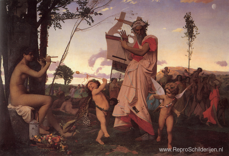 Wij bieden u een ambachtelijke reproductie op doek van het beroemde schilderij 'Bacchus en Anacreon houden van elkaar' van Jean-Leon Gerome, afkomstig uit het Reproductiemuseum.