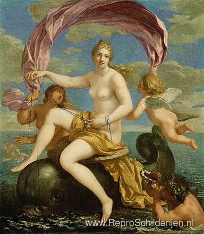 Wij bieden u een ambachtelijke reproductie op doek van het beroemde schilderij 'De triomf van Galatea' van Jacques Stella, afkomstig uit het Reproductiemuseum.