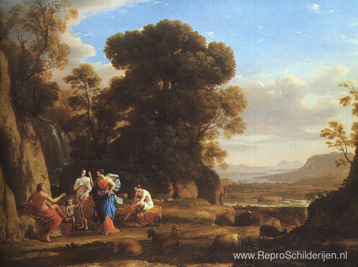Wij bieden u een ambachtelijke reproductie op doek van het beroemde schilderij 'Het oordeel van Parijs' van Claude Lorrain, afkomstig uit het Reproductiemuseum.