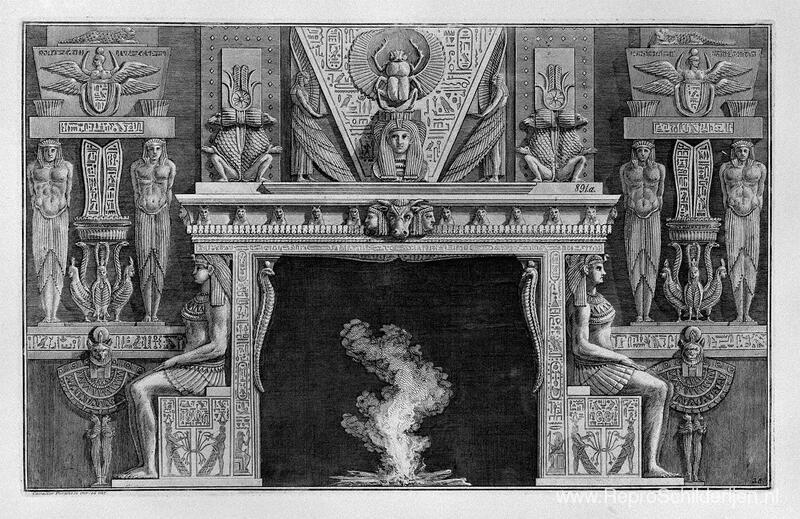Wij bieden u een ambachtelijke reproductie op doek van het beroemde schilderij 'Open haard in Egyptische stijl, de zijkanten twee zittende figur' van Giovanni Battista Piranesi, afkomstig uit het Reproductiemuseum.
