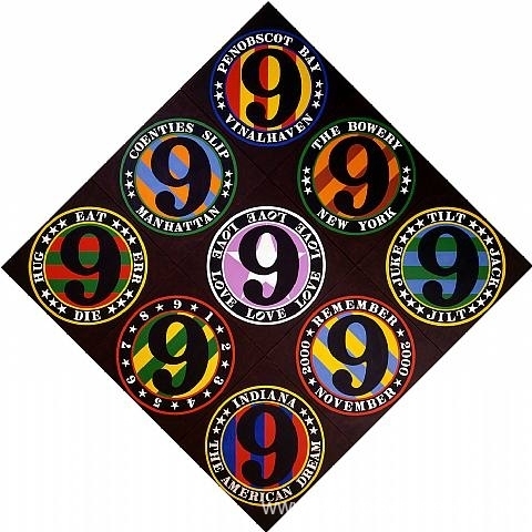 Wij bieden u een ambachtelijke reproductie op doek van het beroemde schilderij 'De negende Amerikaanse droom' van Robert Indiana, afkomstig uit het Reproductiemuseum.