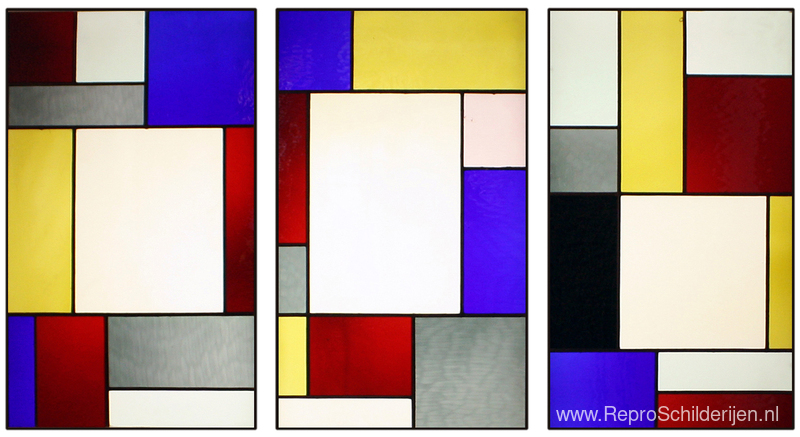 Wij bieden u een ambachtelijke reproductie op doek van het beroemde schilderij 'Driedelig glas-in-loodraam' van Theo van Doesburg, afkomstig uit het Reproductiemuseum.