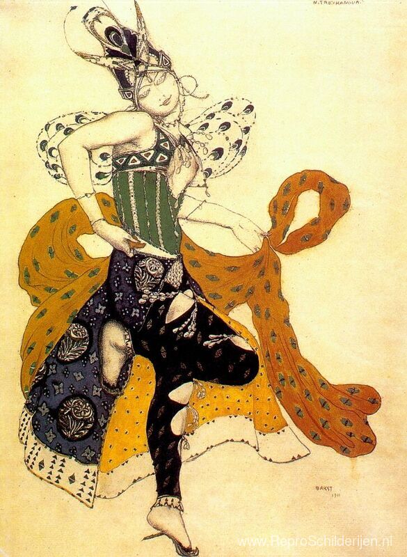 Wij bieden u een ambachtelijke reproductie op doek van het beroemde schilderij 'La peri Natasha Trouhanova als de Peri ' van Leon Bakst, afkomstig uit het Reproductiemuseum.
