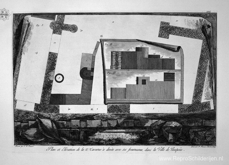 Wij bieden u een ambachtelijke reproductie op doek van het beroemde schilderij 'Uitzicht op de taverne van Pompeii gewijd aan Priapus' van Giovanni Battista Piranesi, afkomstig uit het Reproductiemuseum.