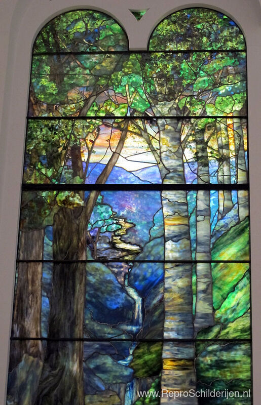 Wij bieden u een ambachtelijke reproductie op doek van het beroemde schilderij 'Venster met zonsopgang in het bos in het voorjaar' van Louis Comfort Tiffany, afkomstig uit het Reproductiemuseum.