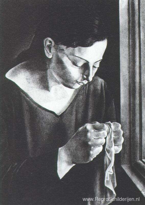 Wij bieden u een ambachtelijke reproductie op doek van het beroemde schilderij 'Ana Maria, Naaien' van Salvador Dali, afkomstig uit het Reproductiemuseum.