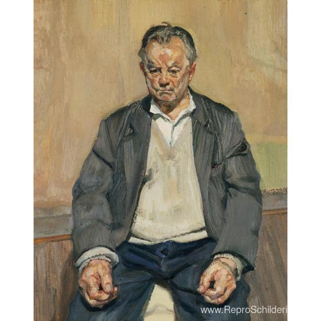 Wij bieden u een ambachtelijke reproductie op doek van het beroemde schilderij 'Bruce Bernard zittend' van Lucian Freud, afkomstig uit het Reproductiemuseum.