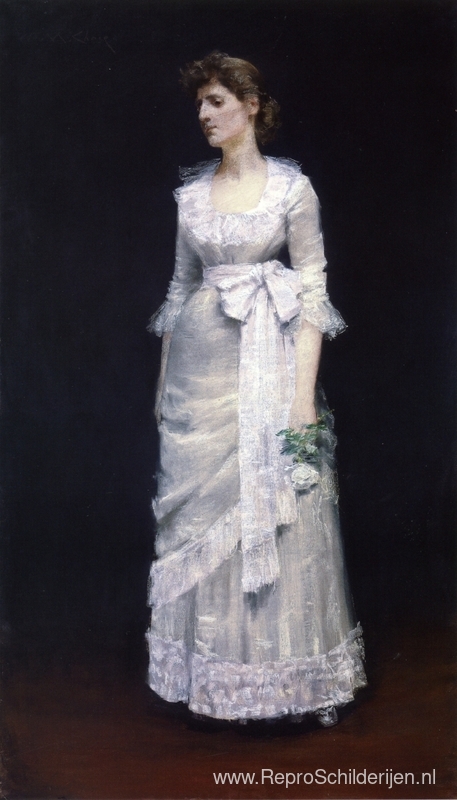 Wij bieden u een ambachtelijke reproductie op doek van het beroemde schilderij 'Dame in witte jurk' van William Merritt Chase, afkomstig uit het Reproductiemuseum.