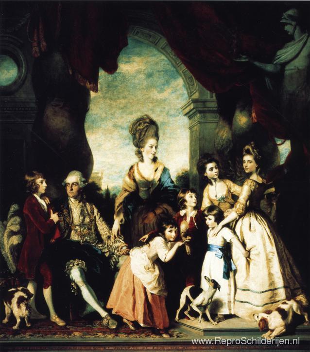 Wij bieden u een ambachtelijke reproductie op doek van het beroemde schilderij 'De familie Marlborough' van Joshua Reynolds, afkomstig uit het Reproductiemuseum.