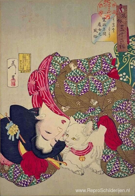 Wij bieden u een ambachtelijke reproductie op doek van het beroemde schilderij 'Een jonge vrouw uit de Kansei-periode die met haar kat speelt' van Tsukioka Yoshitoshi, afkomstig uit het Reproductiemuseum.