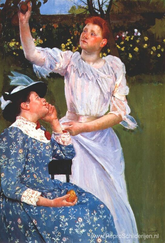 Wij bieden u een ambachtelijke reproductie op doek van het beroemde schilderij 'Jonge Vrouw Fruit Plukken' van Mary Cassatt, afkomstig uit het Reproductiemuseum.