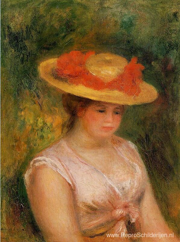 Wij bieden u een ambachtelijke reproductie op doek van het beroemde schilderij 'Jonge vrouw met een strohoed' van Pierre-Auguste Renoir, afkomstig uit het Reproductiemuseum.
