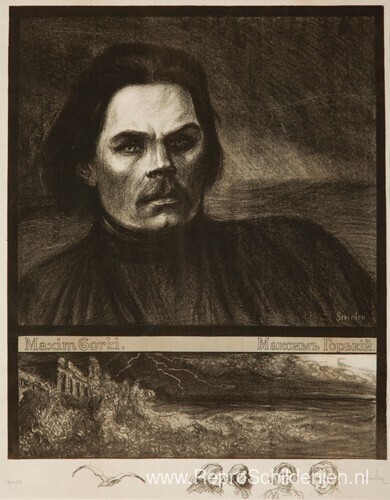Wij bieden u een ambachtelijke reproductie op doek van het beroemde schilderij 'Maxim Gorky halve lengte, gericht' van Theophile Steinlen, afkomstig uit het Reproductiemuseum.