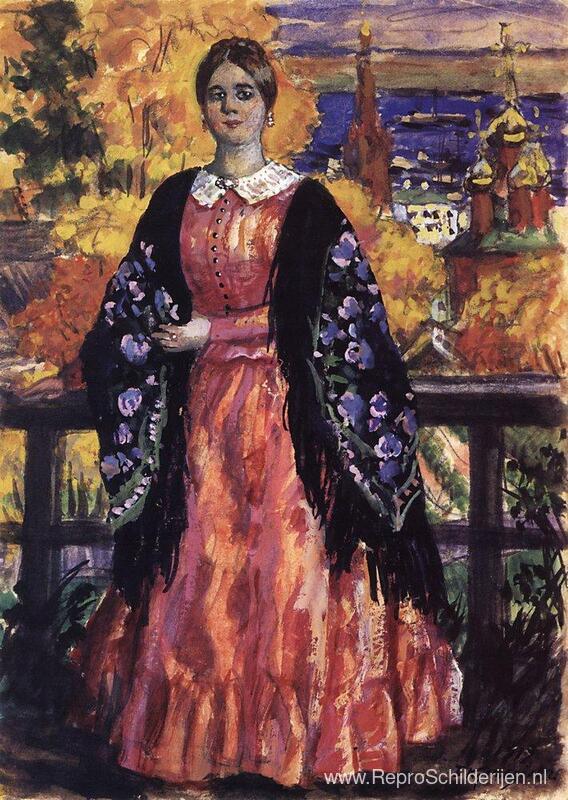 Wij bieden u een ambachtelijke reproductie op doek van het beroemde schilderij 'Mercahnts vrouw' van Boris Kustodiev, afkomstig uit het Reproductiemuseum.