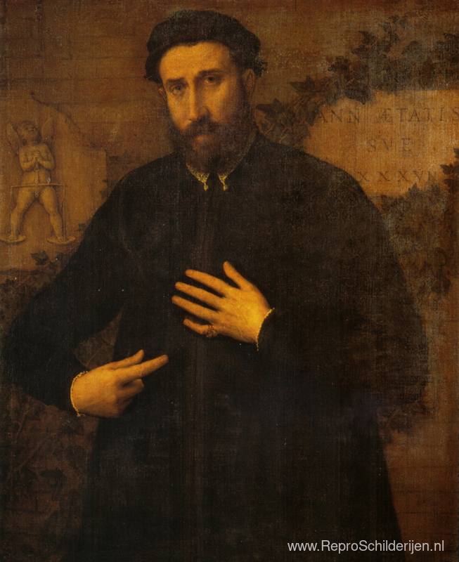 Wij bieden u een ambachtelijke reproductie op doek van het beroemde schilderij 'Portret van een 37-jarige man ' van Lorenzo Lotto, afkomstig uit het Reproductiemuseum.