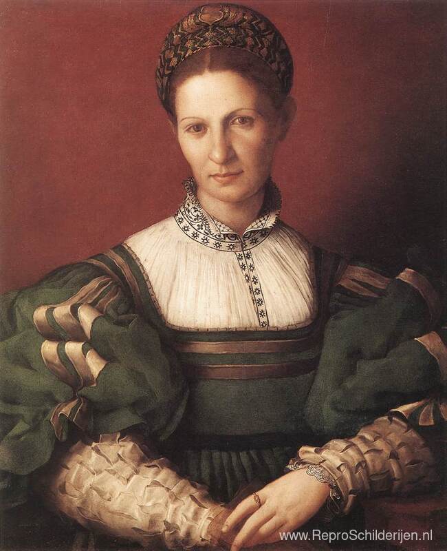 Wij bieden u een ambachtelijke reproductie op doek van het beroemde schilderij 'Portret van een dame in het groen' van Agnolo Bronzino, afkomstig uit het Reproductiemuseum.
