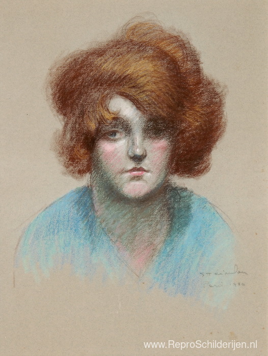 Wij bieden u een ambachtelijke reproductie op doek van het beroemde schilderij 'Portret van een vrouw in blauwe blouse ' van Theophile Steinlen, afkomstig uit het Reproductiemuseum.