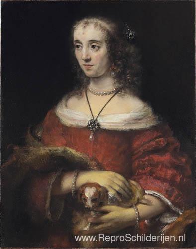 Wij bieden u een ambachtelijke reproductie op doek van het beroemde schilderij 'Portret van een vrouw met een schoothondje' van Rembrandt, afkomstig uit het Reproductiemuseum.