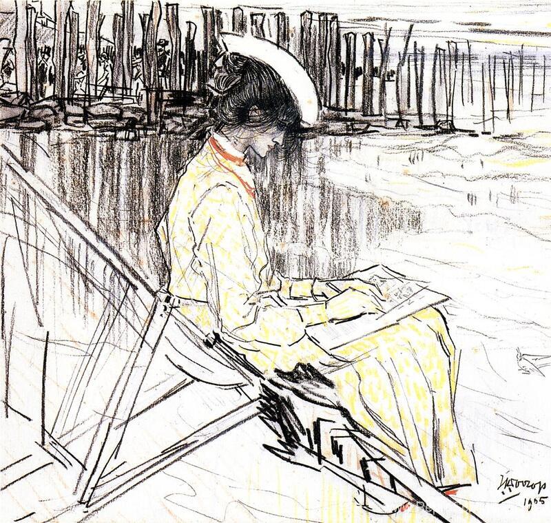 Wij bieden u een ambachtelijke reproductie op doek van het beroemde schilderij 'Portret van Emma Bellwidt op het strand van Domburg' van Jan Toorop, afkomstig uit het Reproductiemuseum.