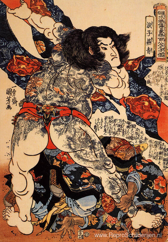 Wij bieden u een ambachtelijke reproductie op doek van het beroemde schilderij 'Roshi Ensei tilt een zware balk op' van Utagawa Kuniyoshi, afkomstig uit het Reproductiemuseum.