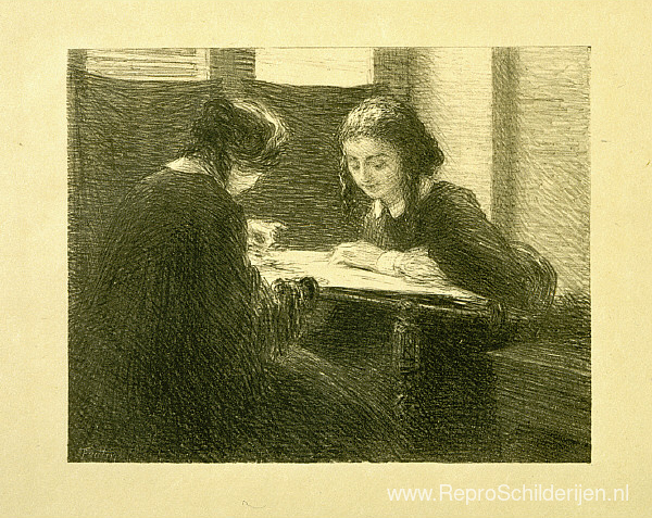 Wij bieden u een ambachtelijke reproductie op doek van het beroemde schilderij 'The-Borduurers, nr. 3' van Henri Fantin-Latour, afkomstig uit het Reproductiemuseum.