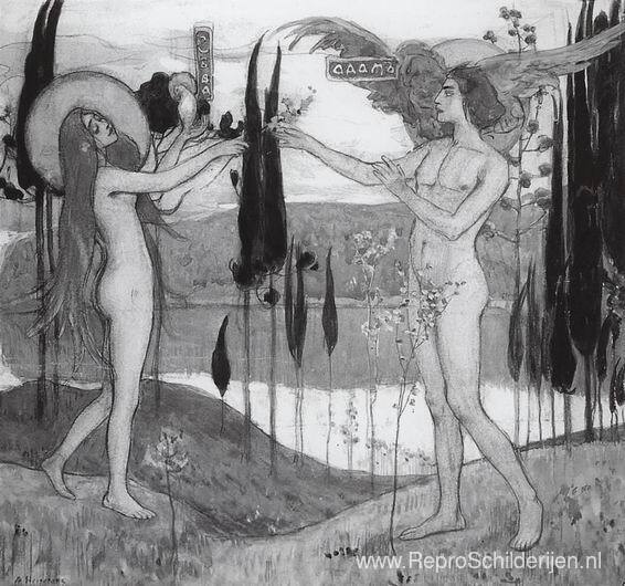 Wij bieden u een ambachtelijke reproductie op doek van het beroemde schilderij 'Adam en Eva' van Mikhail Nesterov, afkomstig uit het Reproductiemuseum.