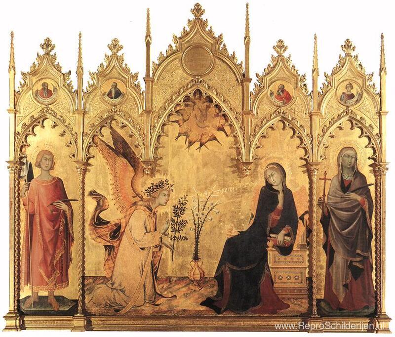 Wij bieden u een ambachtelijke reproductie op doek van het beroemde schilderij 'De aankondiging met St. Margaret en St. Ansanus' van Simone Martini, afkomstig uit het Reproductiemuseum.