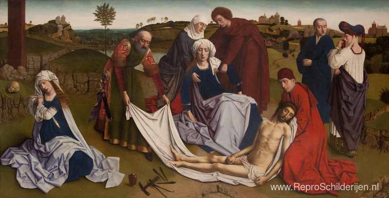 Wij bieden u een ambachtelijke reproductie op doek van het beroemde schilderij 'De klaagzang over de dode Christus' van Petrus Christus, afkomstig uit het Reproductiemuseum.