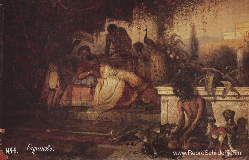 Wij bieden u een ambachtelijke reproductie op doek van het beroemde schilderij 'Een rijke man en Lazarus' van Vasily Surikov, afkomstig uit het Reproductiemuseum.