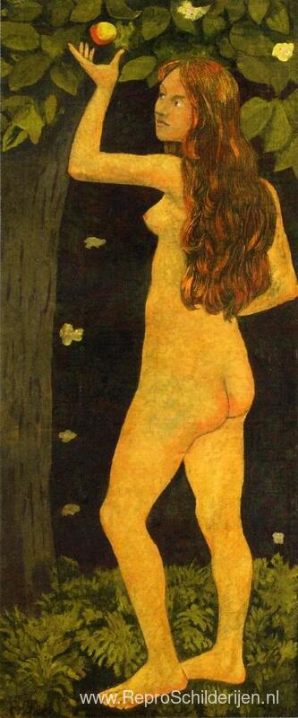 Wij bieden u een ambachtelijke reproductie op doek van het beroemde schilderij 'Eva plukt de appel' van Paul Serusier, afkomstig uit het Reproductiemuseum.