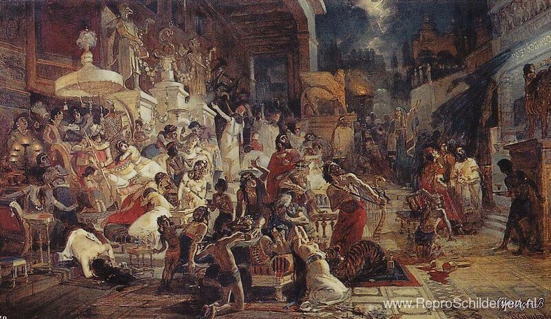 Wij bieden u een ambachtelijke reproductie op doek van het beroemde schilderij 'Het feest van Belsazar' van Vasily Surikov, afkomstig uit het Reproductiemuseum.