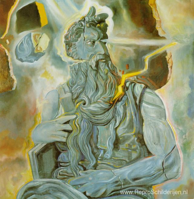 Wij bieden u een ambachtelijke reproductie op doek van het beroemde schilderij 'Naar Michelangelo's 'Mozes', op het graf van Julius II in Rome' van Salvador Dali, afkomstig uit het Reproductiemuseum.