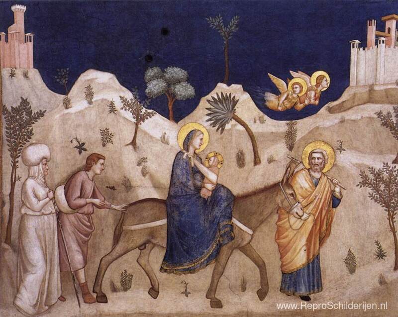 Wij bieden u een ambachtelijke reproductie op doek van het beroemde schilderij 'Vlucht naar Egypte' van Giotto, afkomstig uit het Reproductiemuseum.