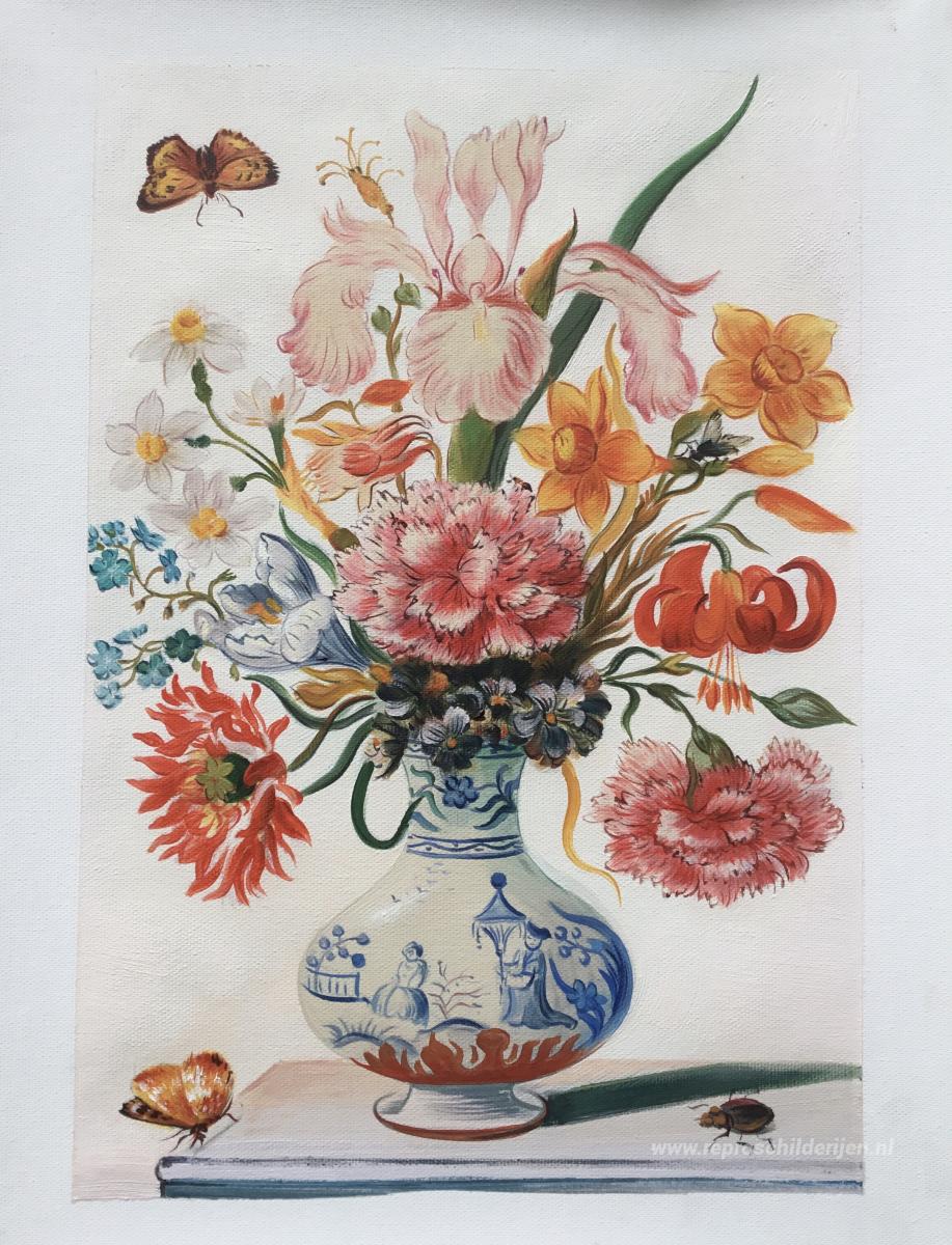 Vaas met klaprozen, korenbloemen, pioenrozen en chrysanten