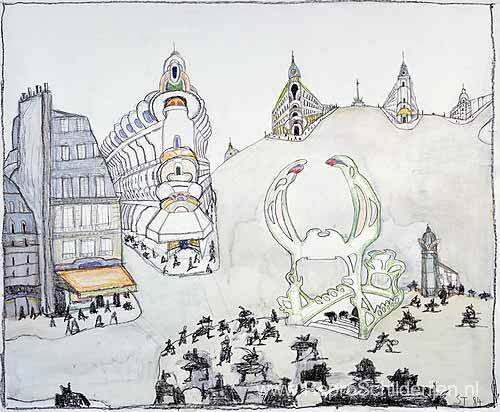 Wij bieden u een ambachtelijke reproductie op doek van het beroemde schilderij 'Parijs' van Saul Steinberg, afkomstig uit het Reproductiemuseum.