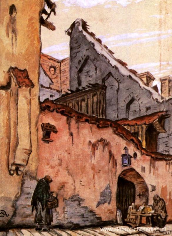Wij bieden u een ambachtelijke reproductie op doek van het beroemde schilderij 'Vilno. Oude muur.' van Mstislav Dobuzhinsky, afkomstig uit het Reproductiemuseum.