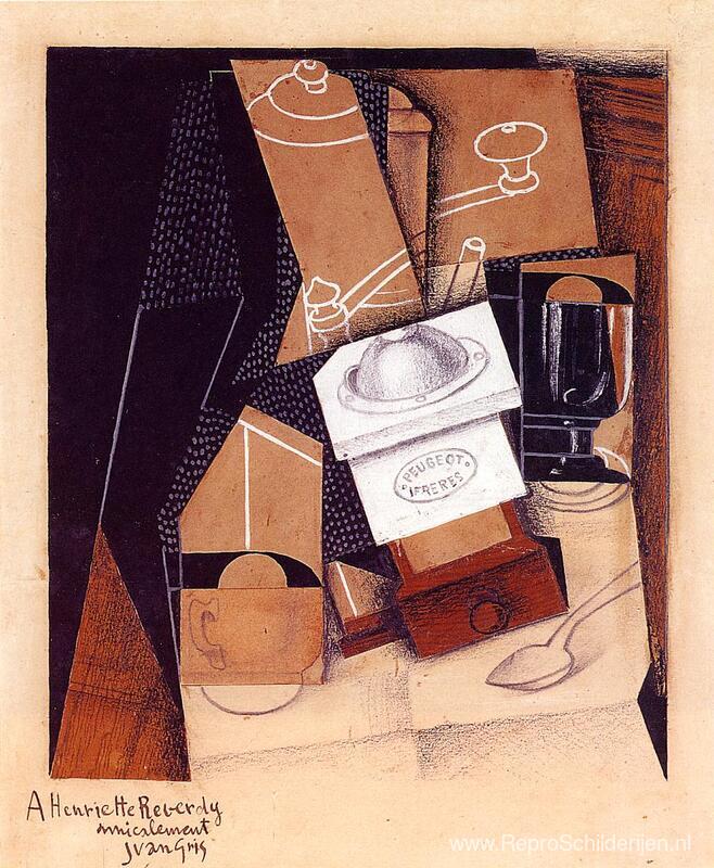 Wij bieden u een ambachtelijke reproductie op doek van het beroemde schilderij 'De koffiemolen' van Juan Gris, afkomstig uit het Reproductiemuseum.