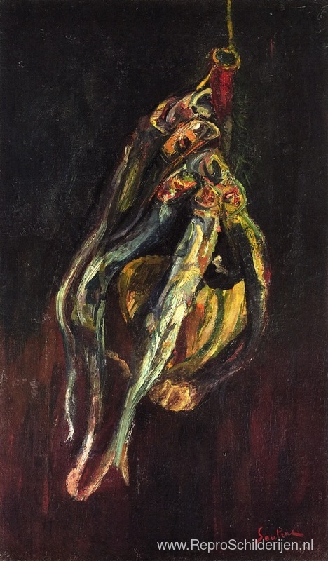 Wij bieden u een ambachtelijke reproductie op doek van het beroemde schilderij 'Haringen en een fles Chianti' van Chaim Soutine, afkomstig uit het Reproductiemuseum.
