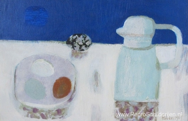 Wij bieden u een ambachtelijke reproductie op doek van het beroemde schilderij 'Kruik en vier eieren' van Mary Fedden, afkomstig uit het Reproductiemuseum.