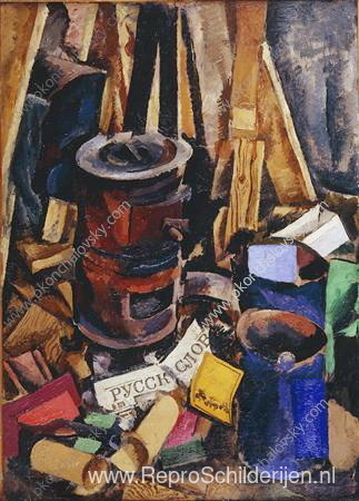 Wij bieden u een ambachtelijke reproductie op doek van het beroemde schilderij 'Stilleven. De kachel.' van Pyotr Konchalovsky, afkomstig uit het Reproductiemuseum.