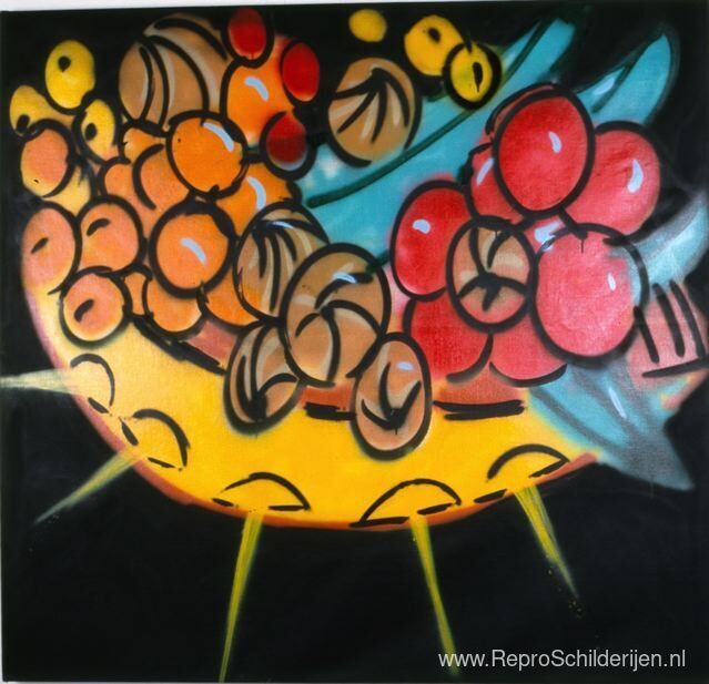 Wij bieden u een ambachtelijke reproductie op doek van het beroemde schilderij 'Stilleven in de ruimte' van Fab 5 Freddy, afkomstig uit het Reproductiemuseum.