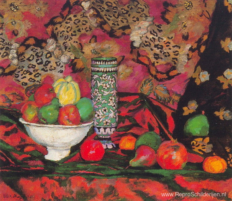 Wij bieden u een ambachtelijke reproductie op doek van het beroemde schilderij 'Stilleven met fruit' van Ilya Mashkov, afkomstig uit het Reproductiemuseum.