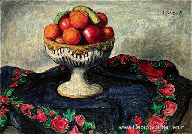 Wij bieden u een ambachtelijke reproductie op doek van het beroemde schilderij 'Stilleven met fruit' van Arthur Segal, afkomstig uit het Reproductiemuseum.