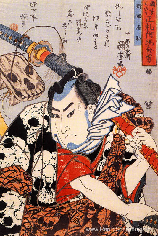 Wij bieden u een ambachtelijke reproductie op doek van het beroemde schilderij 'Nozarashi Gosuke met een lang zwaard' van Utagawa Kuniyoshi, afkomstig uit het Reproductiemuseum.